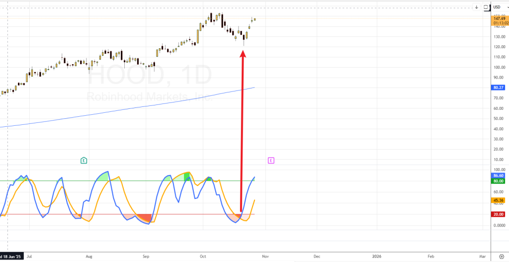 但我們強調這是一個「順勢」部署。結果,HOOD在10月22日便迅速見底回升(圖二),比預期早到。