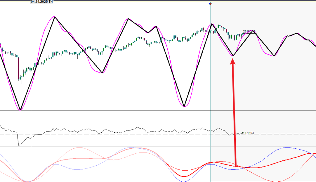 觀察副圖(圖三),多條週期線在13日附近匯聚谷底,形成「週期共振」,預示高概率的轉折點。這就是我們計劃中的「高概率觀察窗口」。